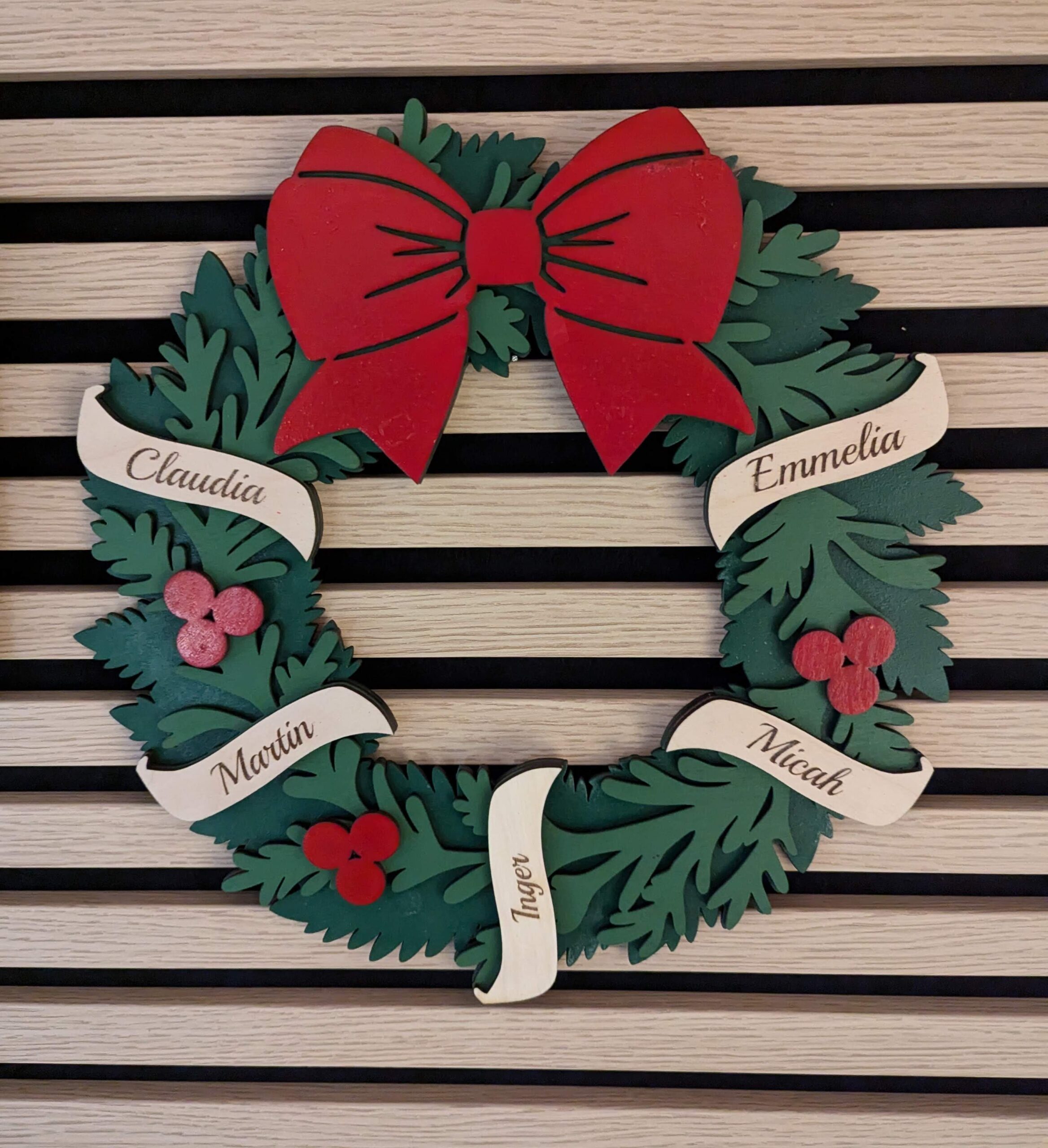 Gør Julen ekstra speciel med en håndlavet julekrans, smukt skåret ud i finer og nænsomt håndmalet. Som noget helt særligt ved denne krans, kan du tilføje de navne der betyder allermest for dig.