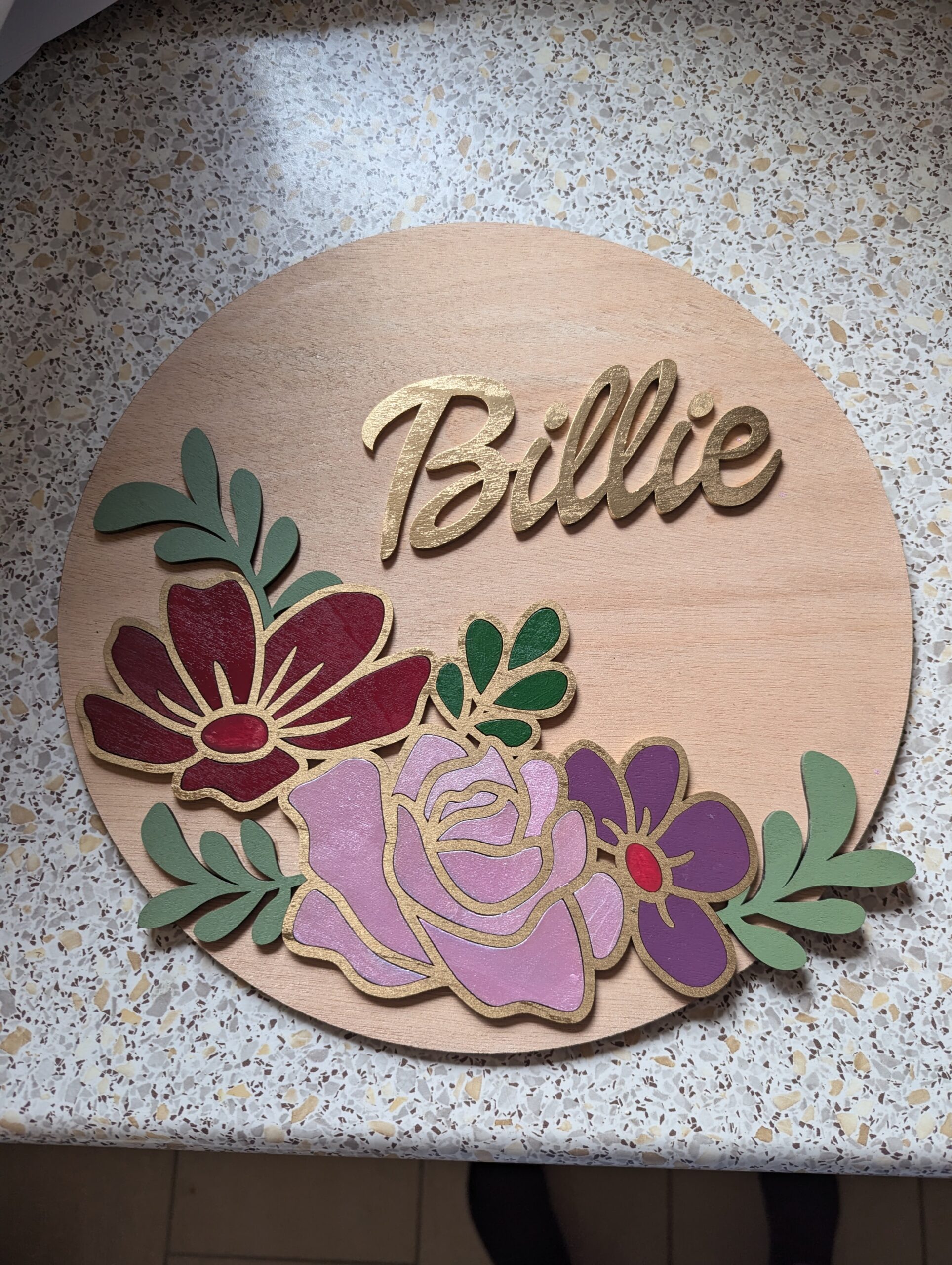 Gør indretningen personlig med dette navneskilt. – Et elegant og rundt træskilt med udskåret navn og farverige blomster detaljer. skiltet er laserskåret og dekoreret med smukke håndmalede blomster i varme farver, som giver det er unikt og livligt udtryk.